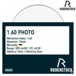 عدسی عینک Rodenstock 1.60 PHOTO با ضریب شکست 1.6 و قطر 70 میلیمتر، انتخابی فتوکرومیک با کیفیت آلمانی است. محدوده نمره (SPH ±6.00 / CYL ±2.00) دارد و مناسب برای استفاده روزمره و فضای باز.