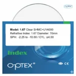عدسی عینک Optex 1.67 Clear SHMC+UV400 با ضریب شکست 1.67 و قطر 70 میلیمتر، انتخابی مقاوم با پوشش ضدخش و محافظت UV است. محدوده نمره (SPH -2.25 تا -10.00 / CYL ±4.00) دارد و مناسب برای نسخههای قویتر اپتومتری.
