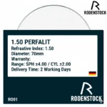 عدسی عینک Rodenstock 1.50 PERFALIT با ضریب شکست 1.5 و قطر 70 میلیمتر، انتخابی مطمئن با کیفیت آلمانی است. محدوده نمره (SPH ±4.00 / CYL ±2.00) دارد و مناسب برای استفاده روزمره.
